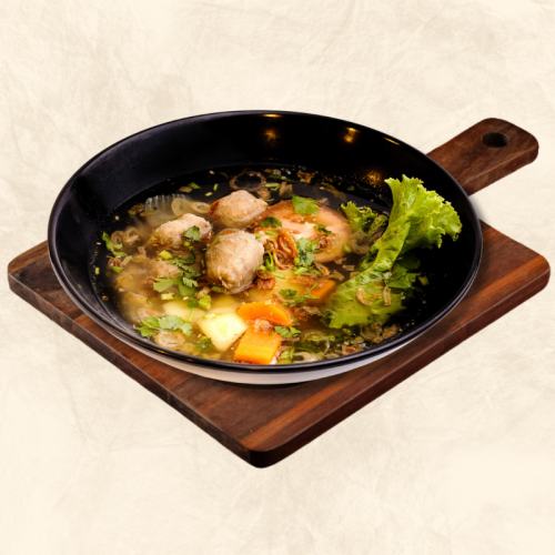Indonesian-style meatball noodle soup featuring tender, juicy beef meatballs in savory broth. Topped with fried shallots and fresh herbs for a hearty, satisfying meal. Price: SGD $7.50